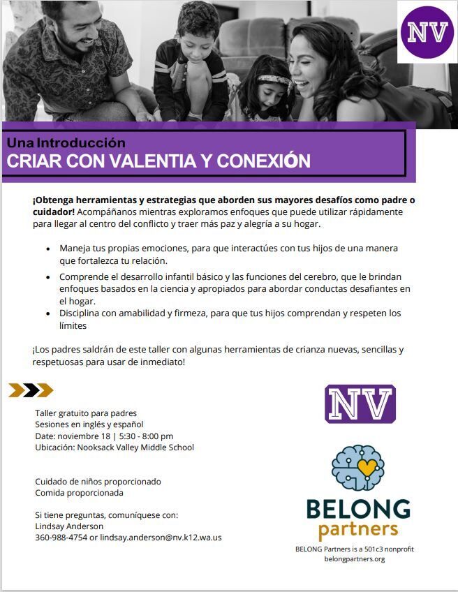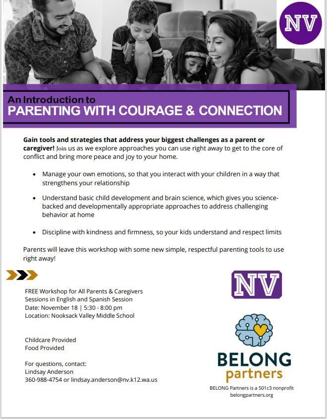Please plan to attend this very helpful, informative workshop being offered for FREE TONIGHT at Nooksack Valley Middle School.  A great opportunity for families in our community to learn and grow.  The Parenting with Courage & Connection Workshop is designed for all parents to address common challenges associated with raising children & teens. Parents will learn brain-based strategies to address conflict, strengthen connections with their kids, respectfully discipline, and more.