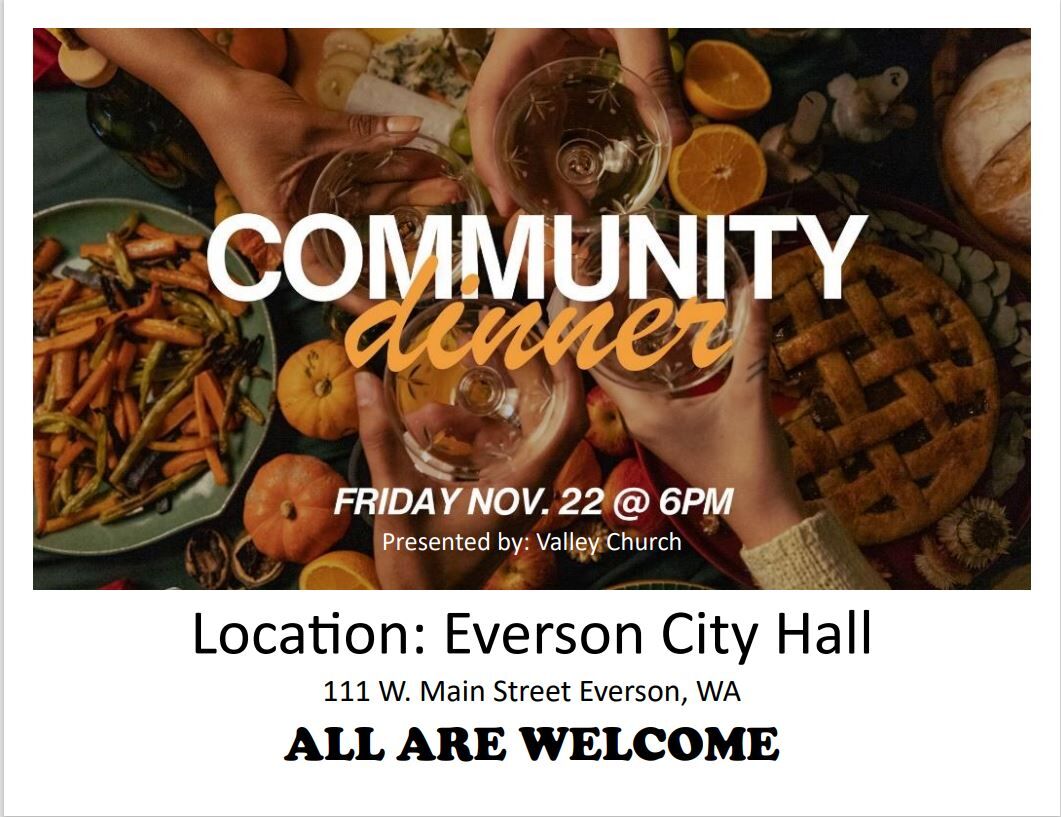Community Dinner.  Friday, Nov. 22 at 6:00 pm.  Presented by Valley Church.  Location:  Everson City Hall 111 W. Main Street, Everson WA.  ALL ARE WELCOME.